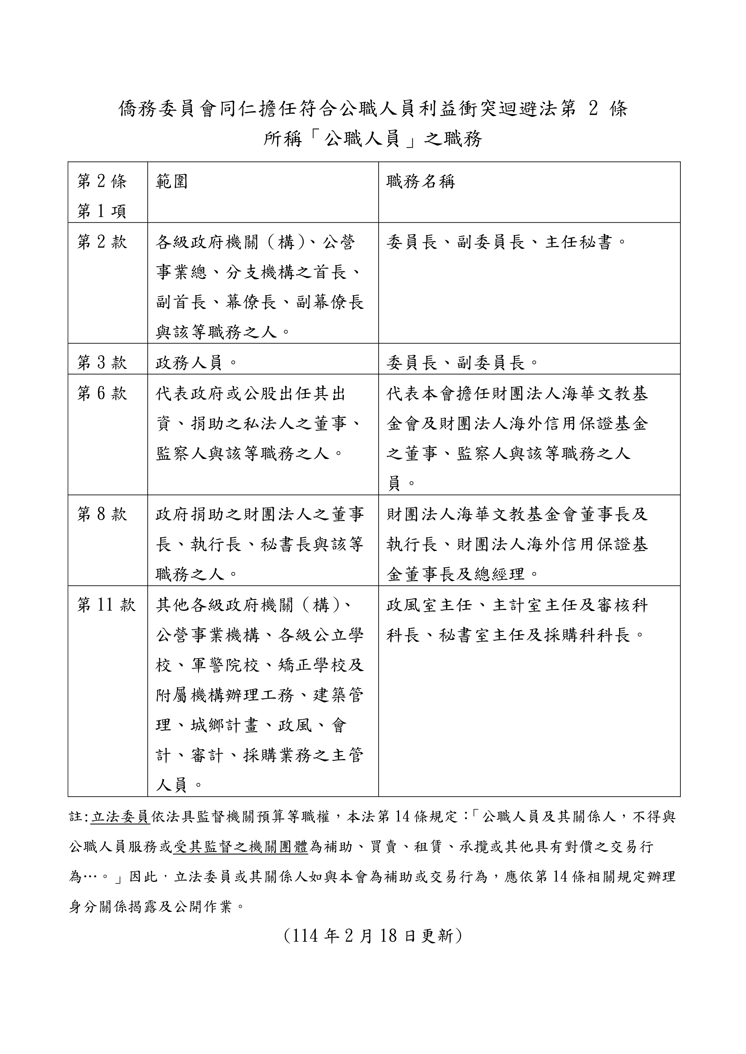 僑務委員會同仁擔任符合公職人員利益衝突迴避法第2條所稱「公職人員」職務(1459KB)