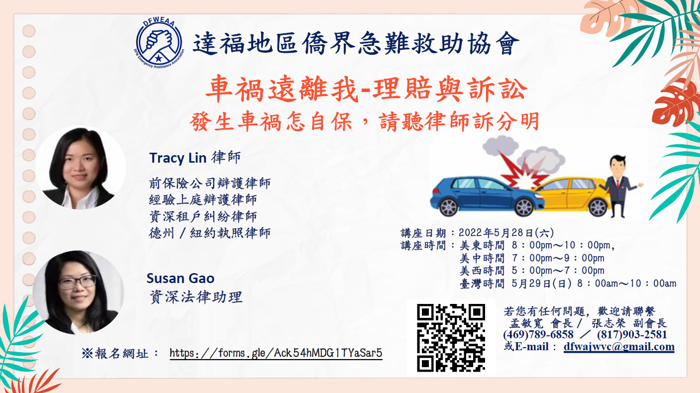 達福地區急難救助協會主辦的車禍遠離我 - 理賠與訴訟線上講座,於5月28日晚圓滿結束。講座開始,孟敏寬會長以去年4月份的留學生車禍個案進行說明,表示該案顯露出僑胞遇到車禍時應對能力不足,故舉辦此次講座,休士頓華僑文教服務中心陳奕芳主任上網致詞,肯定達福地區急難救助協會平日對社區的幫助。