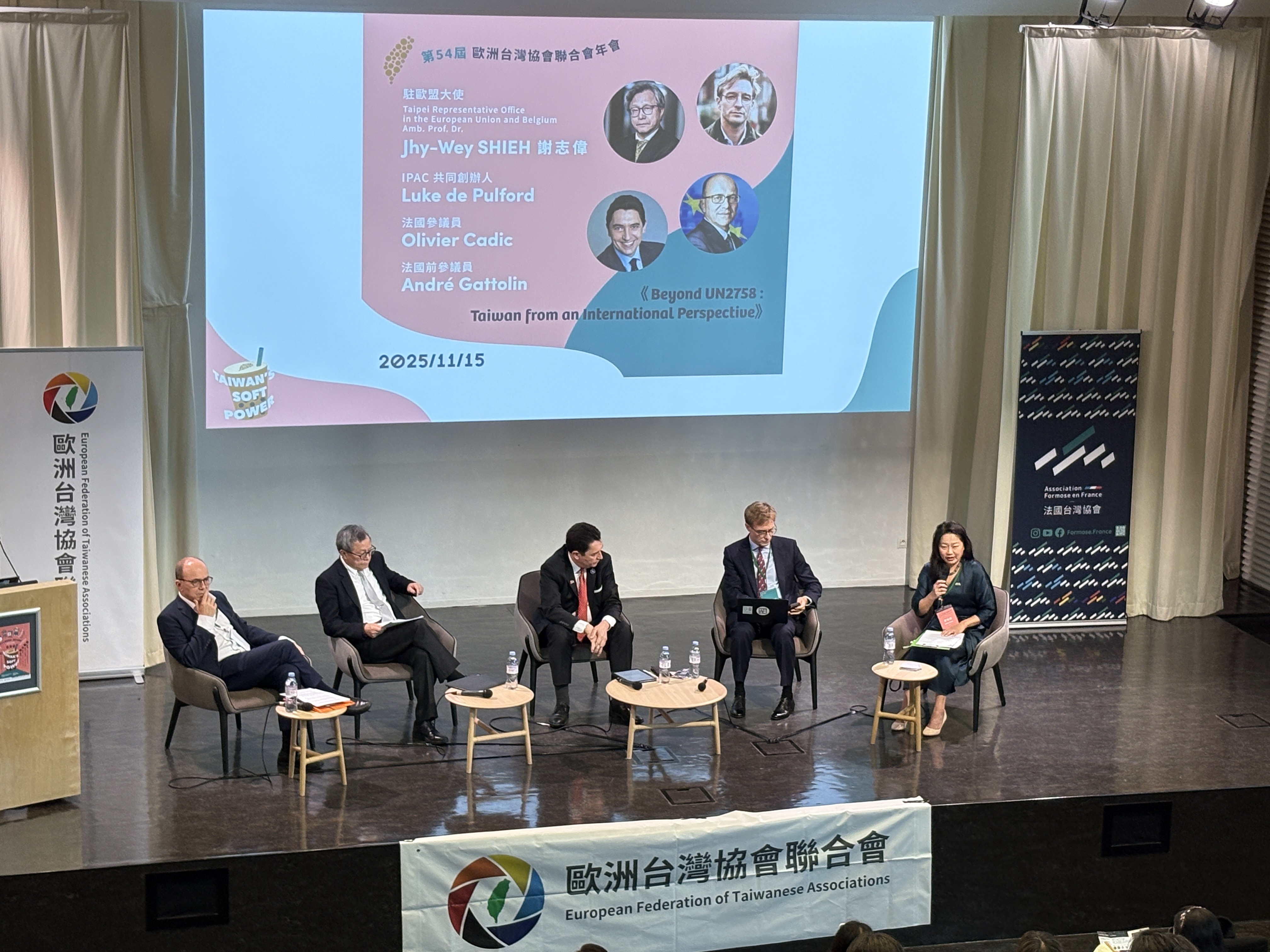 歐洲臺灣協會聯合會暨法國臺灣協會於2025年11月15日至16日在法國巴黎國際東方語學院(Inalco)舉辦「2025年會」,賴清德總統及僑務委員會徐委員長佳青特別錄製祝賀影片,出席貴賓計有駐法國郝培芝大使、駐歐盟兼駐比利時謝志偉大使、法國參議員Olivier CADIC、對中政策跨國議會聯盟(IPAC)共同創辦人Luke de Pulford(裴倫德)、法國前參議員André GATTOLIN、行政院政務顧問傅佩芬、歐洲各國臺灣協會會員及友我主流人士約120人。開幕典禮後舉辦「看不見的國家」放映座談,與會貴賓共同討論各國議會如何以實際行動支持台灣參與國際社會及台海安全攸關地緣政治穩定等議題。