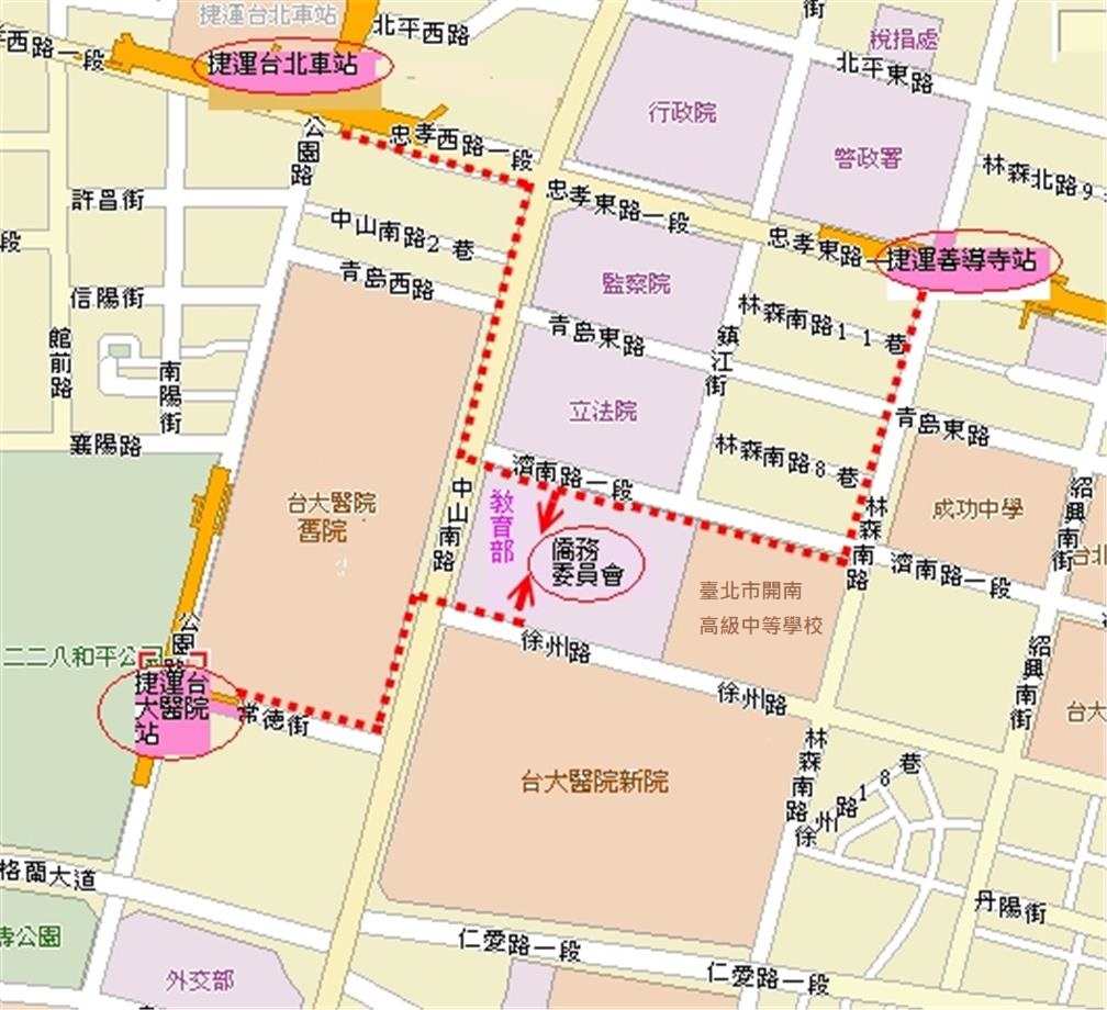 於中正紀念堂站步行約10-15分鐘至本會,亦可於中山站轉搭紅線至台大醫院站或臺北車站步行約5-10分鐘至本會 |