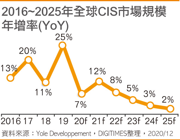 然疫情徘徊不去,再加上地緣政治格局不確定性等因素的影響,預估2020年CIS市場規模年增幅度會下滑至7%,至2025年的市場規模年複合成長率(CAGR)也會下滑至5.7%(2025年規模約280億美元)。
