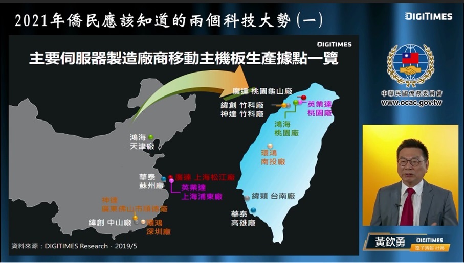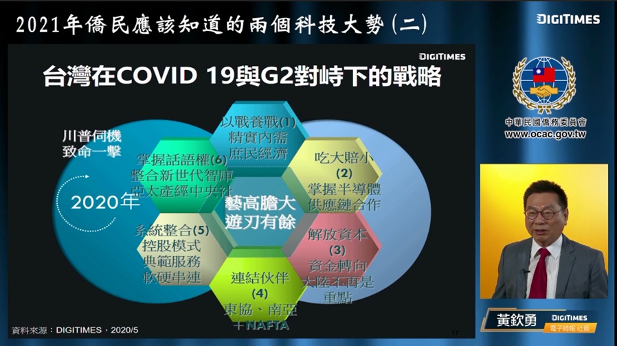 僑務委員會為協助海外僑臺商掌握臺灣高科技產業關鍵資訊,特別邀請臺灣電子時報Digitimes黃欽勇社長分享僑民應知的兩個科技大勢:「臺灣的供應鏈與半導體」,藉由產業九宮格、未來車策略矩陣、半導體產業結構圖等,細說臺灣半導體的重要性,供應鏈的完整性與未來的因應策略與潛在商機。