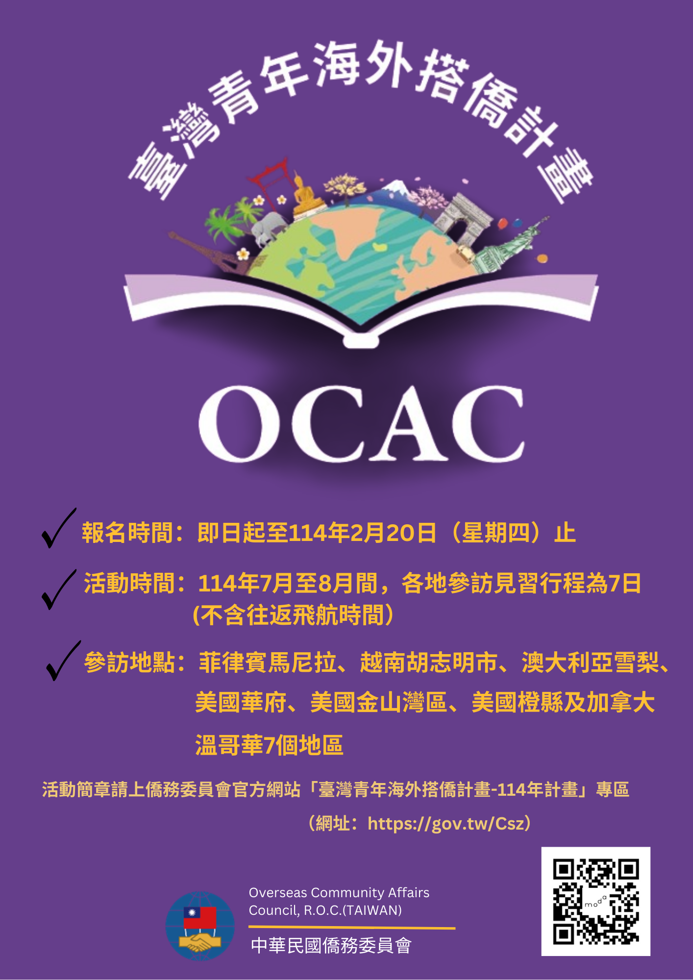114年本會規劃賡續於菲律賓馬尼拉、越南胡志明市、澳大利亞雪梨、美國華府、美國金山灣區、美國橙縣及加拿大溫哥華等7個地區辦理搭僑計畫,各地區預定錄取12人,總計將甄選84位學員赴海外進行為期7日的僑務參訪見習,行程重點包含僑務見習、認識僑社、特色活動、青年交流、主流參訪、行銷臺灣及僑見創藝等,期望青年學子藉由本計畫認識政府駐外及僑務工作,拓展國際視野,搭建與僑界之橋梁,也以年輕人的觀點、創意及才藝,向海外僑胞與國際友人介紹臺灣,成為助力行銷臺灣的僑務青年大使。