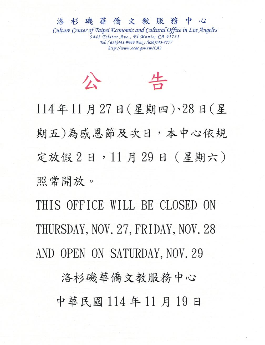 感恩節114年11月27日(四)及28日(五)中心休館