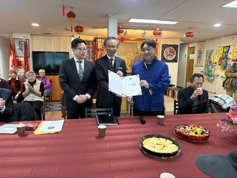 適逢多倫多龍岡親義公所新屆主席選出,梁毅鵬轉頒僑務委員會委員長徐佳青賀狀及感謝狀,分別予劉偉雄、趙挺秀,並由藍柏青宣讀賀狀暨感謝狀後合影。