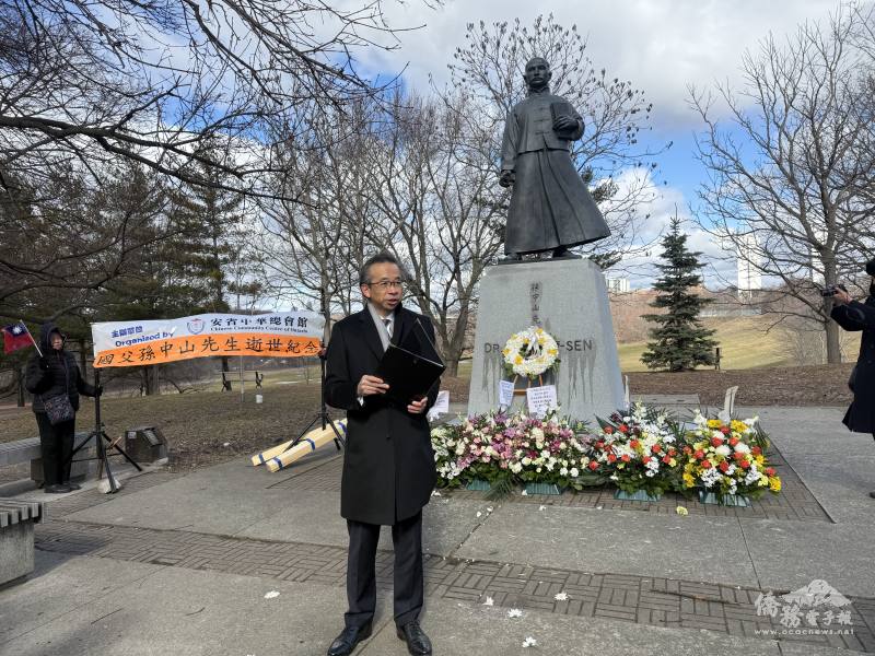駐多倫多辦事處處長梁毅鵬擔任主禮官,他表示多倫多河谷公園是華埠重要的文化地標,與國父有深厚的歷史連結。129年前,國父孫中山先生為推翻帝制創建民國,曾三次造訪多倫多,1911年在多倫多發表許多重要演講,宣揚民主革命理念;許多僑胞前輩不惜抵押房產慷慨解囊,當年10月發動辛亥革命,多倫多僑界的支持被視為海外的重要力量之一。國父逝世101年後僑胞齊聚此地,展現緬懷國父領導革命、開創民主功績,更實踐守護民主自由價值,繼續為加臺雙邊關係深化及僑界繁榮努力。梁毅鵬感謝安省中華總會館林共同主席樹榮秉持團結僑界,傳承中華文化並堅定支持中華民國初衷,辦理紀念儀式,表達對國父最高的尊崇。
