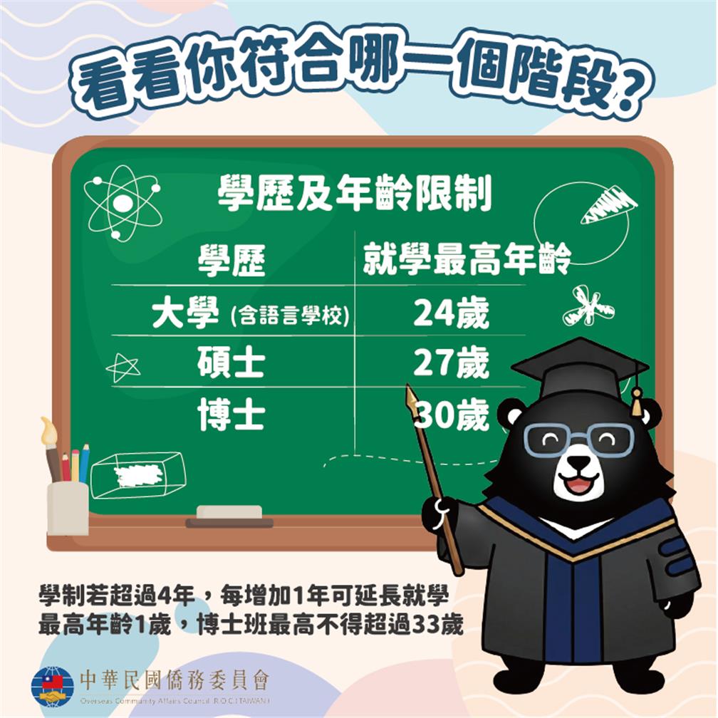 (醫學院等特殊學制若超過4年,每增加1年可延長就學最高年齡1歲,博士班最高不得超過33歲)