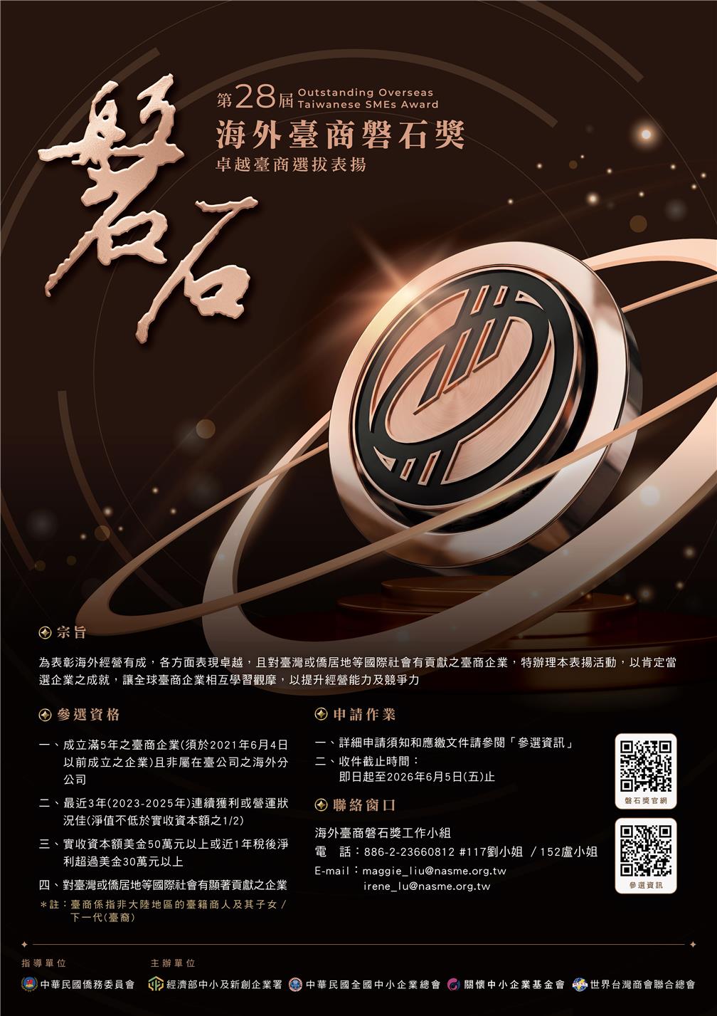 【活動公告】「第28屆海外臺商磐石獎」,報名截止至115年6月5日