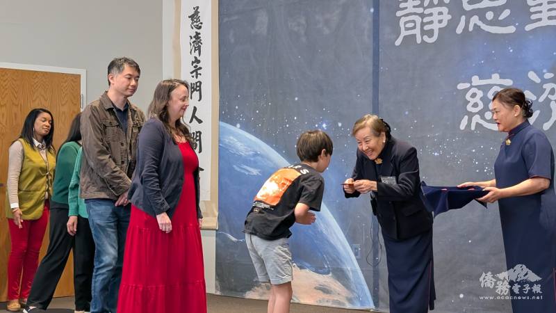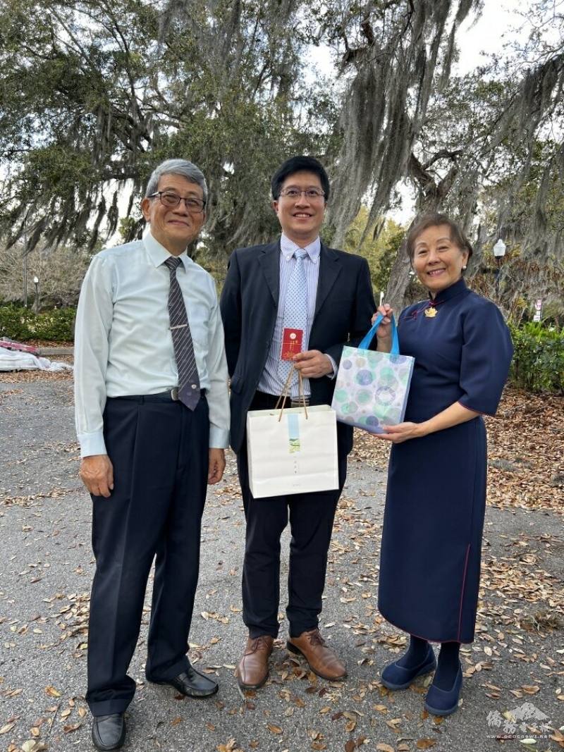 僑務秘書杜戎珄(中)與慈濟奧蘭多負責人楊甦蘇(右1)合影