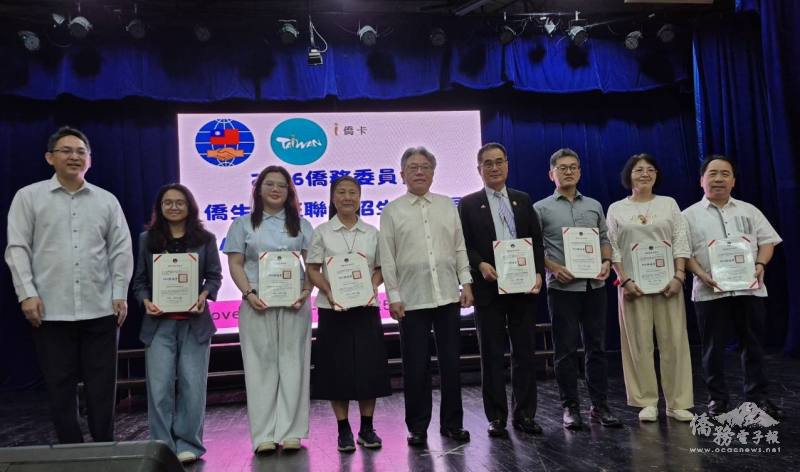 駐菲律賓代表處公使楊登仕(中)頒發僑務委員會保薦單位聘書予臺菲教育基金會、宿霧聖嬰蒙特梭利學校、宿霧同心學校、獨魯萬鳴遠學校、怡省郊亞鄢南星中學、菲華僑聯協會及菲律賓蘇比克灣臺商協會。
