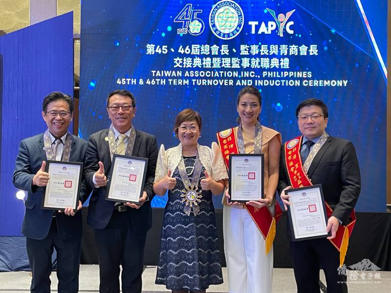 監事長交接由徐佳青(中)見證,駐菲律賓代表處大使周民淦(左2)及亞洲臺灣商會聯合總會監事長鄭美滿(右2)共同監交