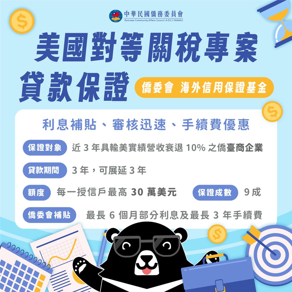 二、僑委會另協輔基金開辦「美國對等關稅專案貸款信用保證要點」,近3年具輸美實績之僑臺商企業,因美國關稅影響導致營收下滑達10%者,可申請最高30萬美元的專案貸款保證,保證成數9成,最長保證期間6年,由僑委會補貼最長3年之保證手續費及最長半年之部分利息,以協助僑臺商穩健經營、渡過難關。