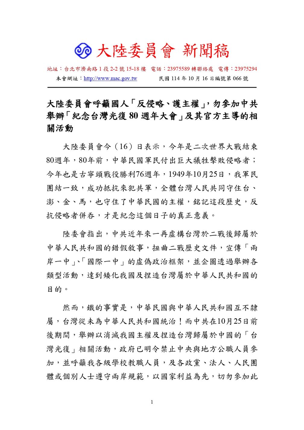 【陸委會】20251016第066號新聞稿:大陸委員會呼籲國人「反侵略、護主權」,勿參加中共舉辦「紀念台灣光復80週年大會」及其官方主導的相關活動 (1).pdf