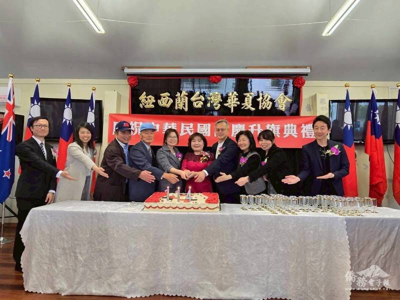 紐西蘭臺灣華夏協會理事長林涵婷、駐奧克蘭辦事處處長陳詠韶及所有嘉賓共同切下生日蛋糕,祝賀中華民國生日快樂