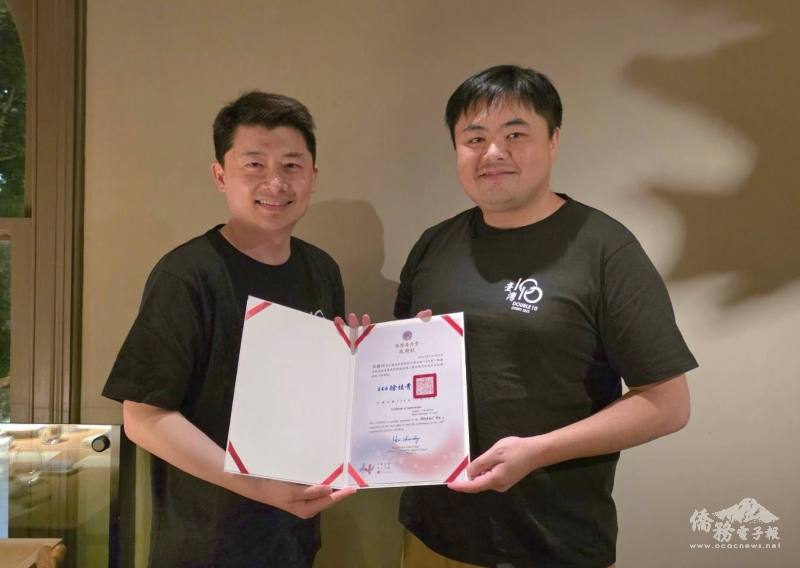 駐雪梨辦事處處長吳正偉(左)代表僑委會委員長徐佳青致贈感謝狀予慶籌會,總召吳鎧圳(右)代表接受