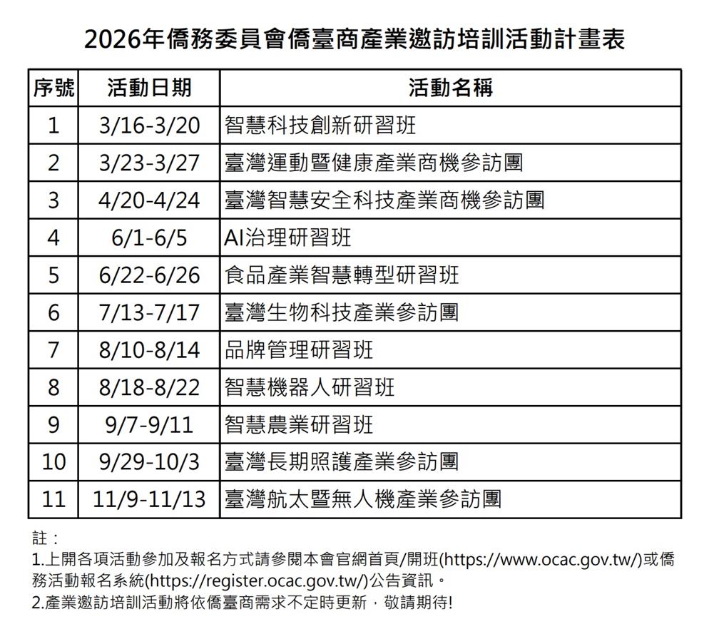 📣2026年僑務委員會僑臺商產業邀訪培訓活動計畫搶先看🧑🏫👩🏫 https://reurl.cc/9bbzvv ✅各項活動參加及報名方式請參閱僑委會官網首頁/開班( https://www.ocac.gov.tw/ )及僑務活動報名系統( https://register.ocac.gov.tw/ )公告資訊 ✅產業邀訪培訓活動將依僑臺商需求不定時更新,敬請期待!