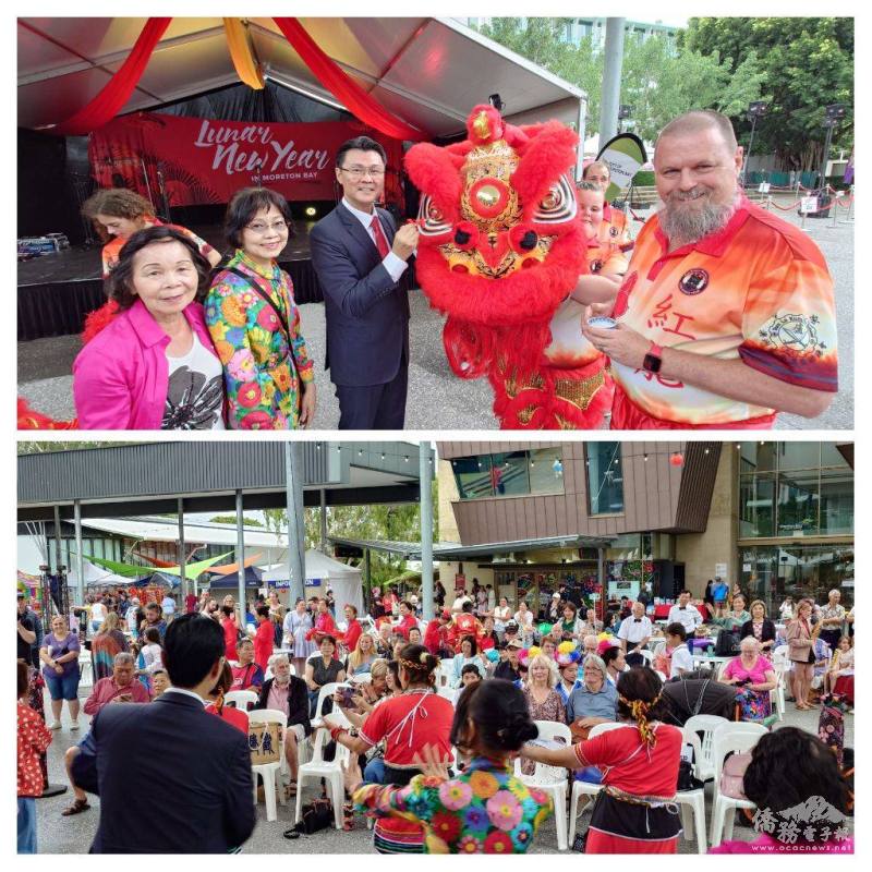 駐布里斯本辦事處與昆士蘭多個臺僑社團,2月14日應邀前往昆士蘭摩頓灣區(Moreton Bay)卡布丘(Caboolture)市政廣場,參加當地歡慶農曆新年文化活動。駐布里斯本辦事處處長范厚祿偕全體同仁及昆士蘭臺灣中心主任許俊湧與會,僑務委員羅富齡、徐瑞雲、僑務諮詢委員柯文耀、昆士蘭臺僑團體聯合會秘書長姜如霞、各臺僑社團會長與鄉親,以及昆士蘭州多元文化廳長Fiona Simpson、摩頓灣區議員Adam Hain,各族裔民眾近千人次共襄盛舉。