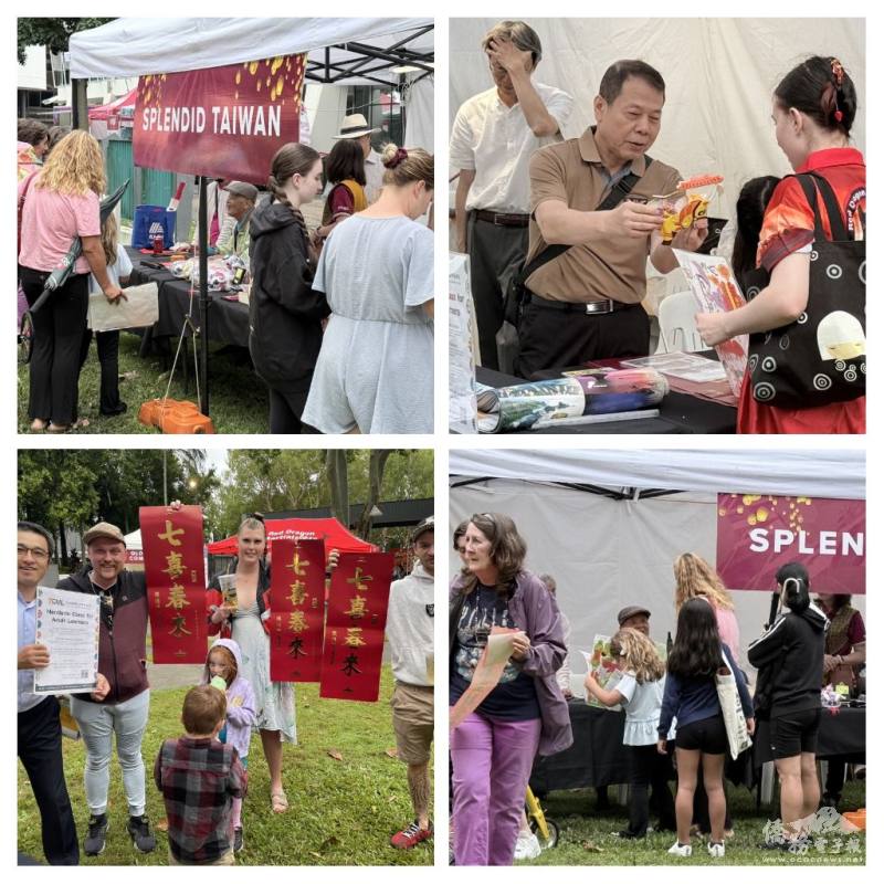 駐布里斯本辦事處的現場攤位,邀請書法老師現場揮毫贈送民眾春聯,也贈送總統府「七喜春來」春聯、各式臺灣觀光文宣、僑委會馬年提燈紙雕,以及台灣華語文學習中心宣傳等多項展示,受到當地社區家庭友人參觀詢問。