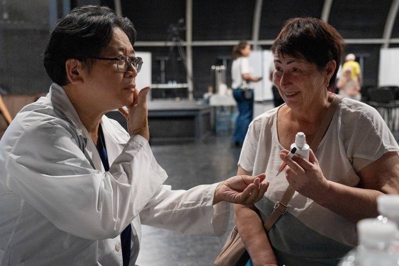 「北美洲台灣人醫師協會」再度前往烏克蘭義診,為基輔民眾與軍人提供醫療服務。在當地的移動診所內,民眾可接受血壓、血糖、尿酸與膽固醇等基本檢查。圖為台灣醫師開藥給患者娜塔莉亞(右)