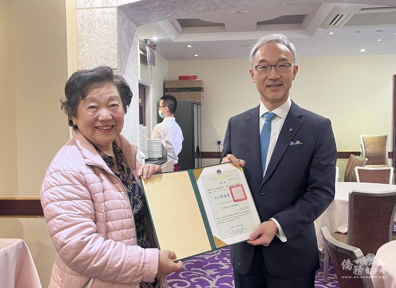 姚金祥頒發僑務促進委員聘書予臺灣佛教慈濟基金會英國聯絡處朱建隆,肯定其對僑社發展與交流推動之貢獻。