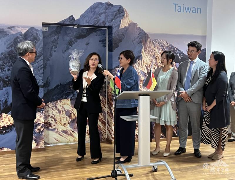 法蘭克福僑務委員劉淑慧(左2)致贈法蘭克福名產予謝志偉留念