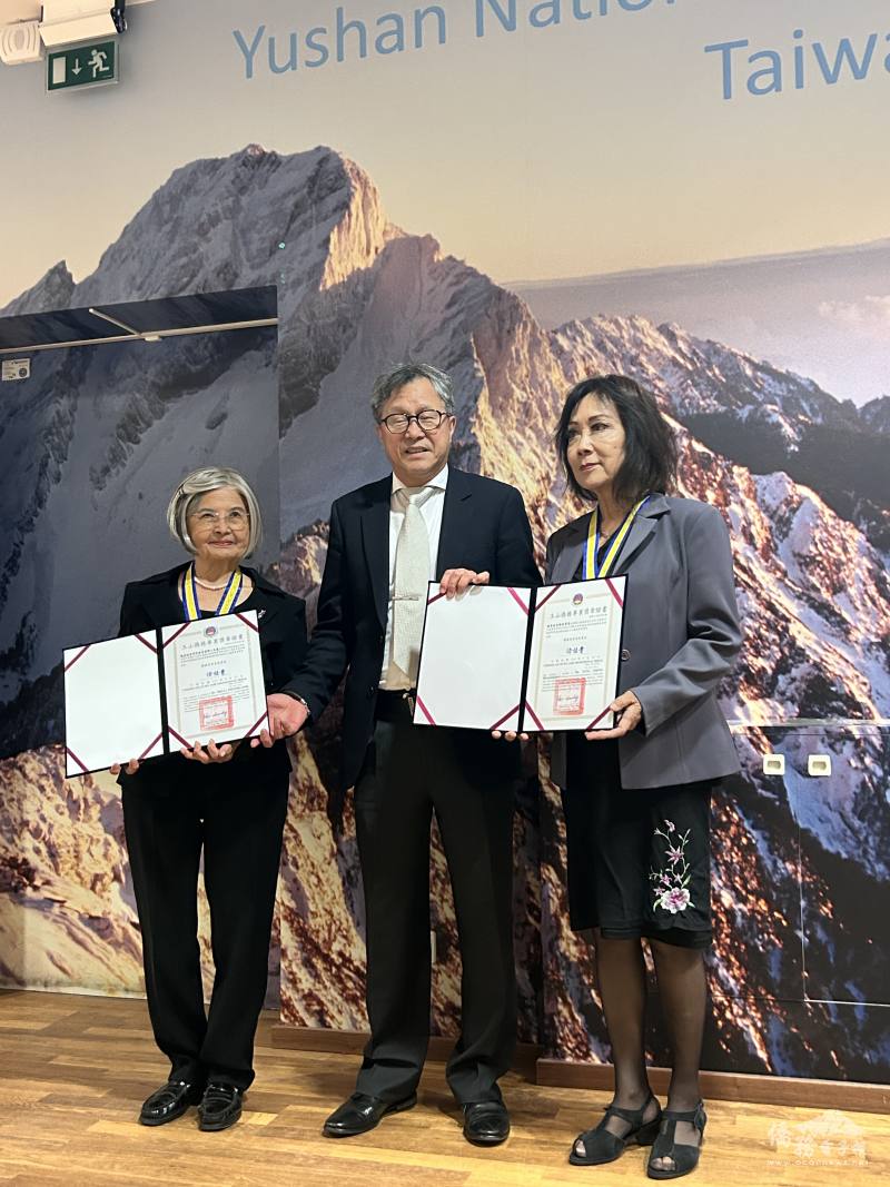 謝志偉(中)頒發玉山僑務專業獎章給葉美麗博士(左)及女士鄭瑩(右),表彰公眾外交著力甚深