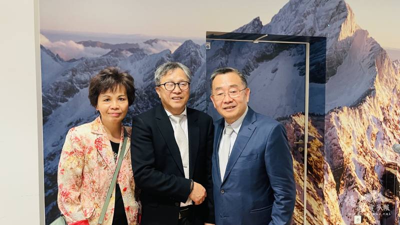漢堡僑務諮詢委員楊文村(右)及中華會館執行秘書許美娟(左)代表漢堡僑界祝福謝志偉