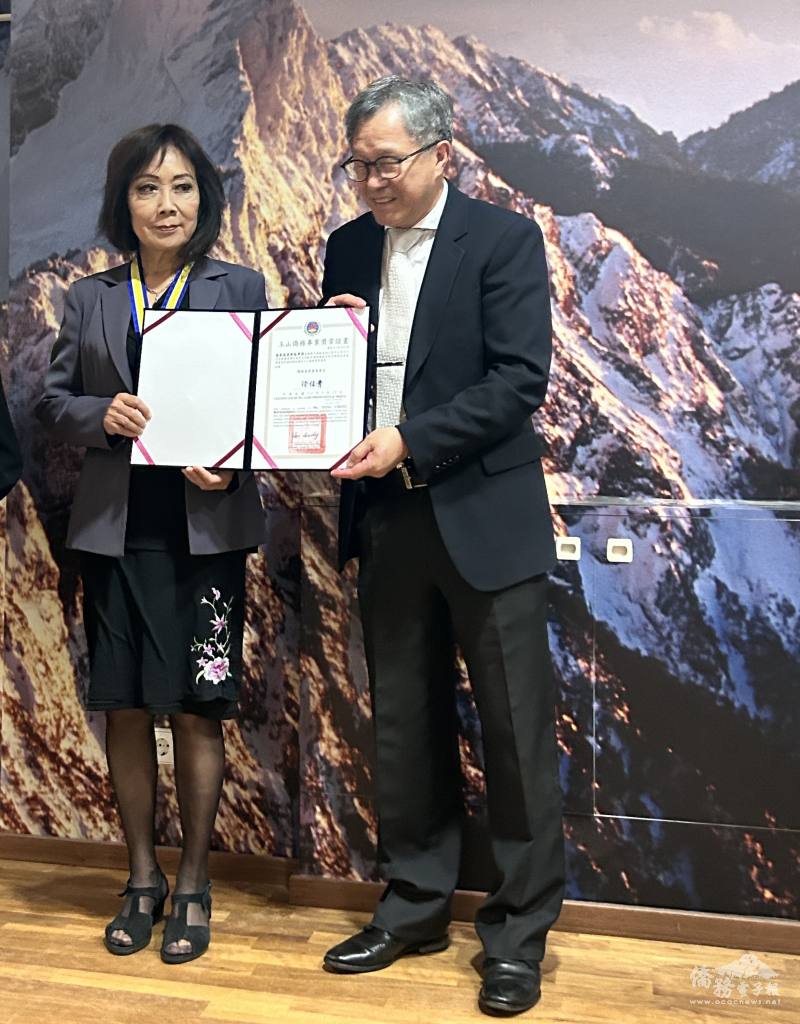 謝志偉頒發玉山僑務專業獎章予鄭瑩