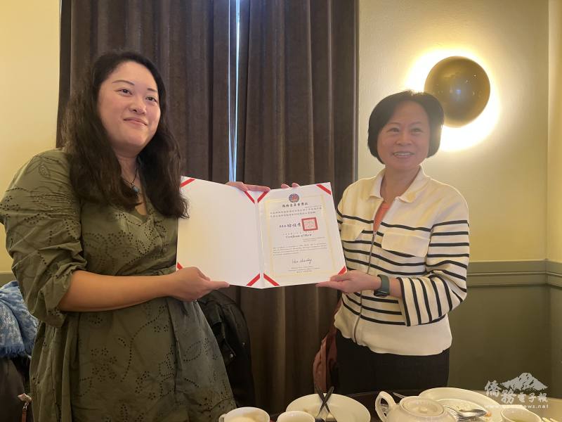 駐德國代表處公使朱麗玲(右)頒發獎狀給任教滿10年的老師胡嘉珊(左)