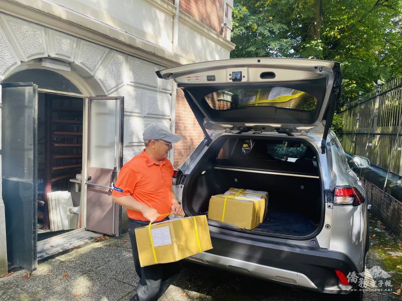 鍾啟元及鄭月鳳逐箱將厚重教科書搬放置後車廂