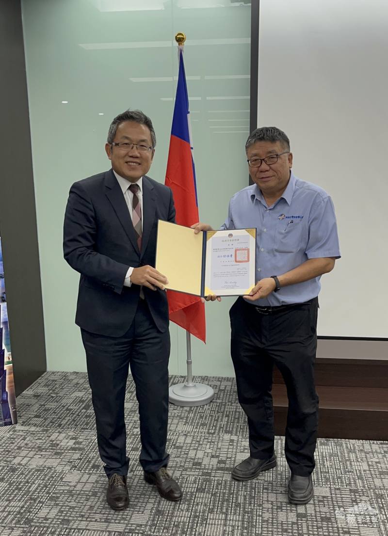 駐越南代表處大使劉世忠(左)代表僑務委員會委員長徐佳青頒發續任僑務促進委員蔡建修(右)聘書