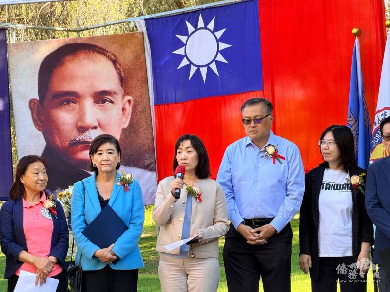 包括聯邦眾議員趙美心(右六)、加州眾議員方樹強(右四)等民選官員與嘉賓一同緬懷孫中山