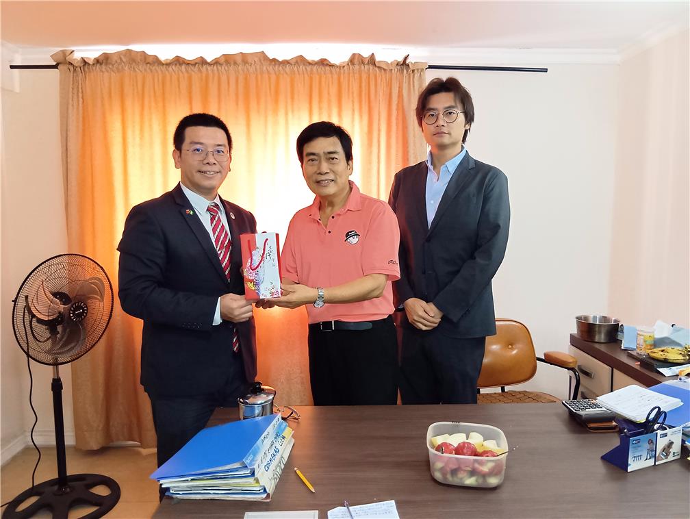 詹前校拜會永拓公司董事長林永芳(中)、經理林子立(右),並致贈台灣茶禮與總統府福袋。