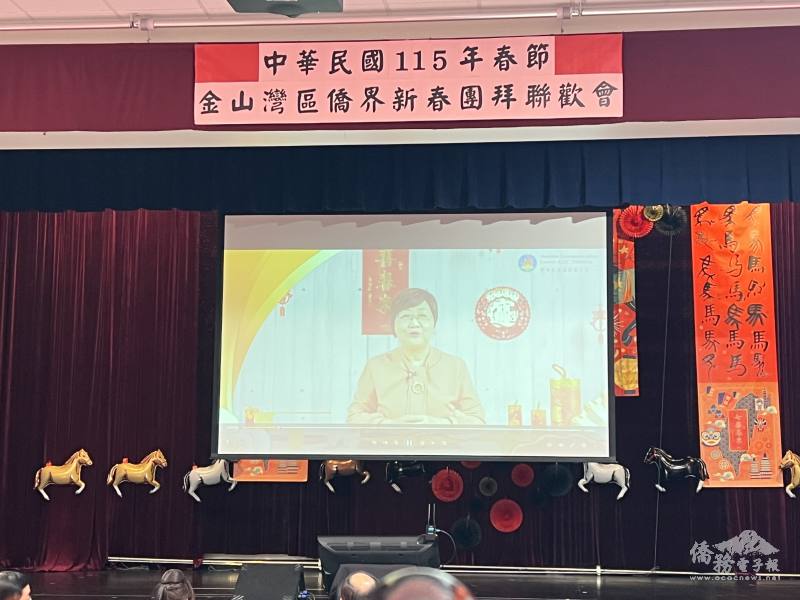 活動中播放僑委會委員長徐佳青錄製的新春祝賀影片,她感謝全球僑胞長年在海外辛勤耕耘,為臺灣拓展國際能見度,祝福大家新春開運、宏圖大展、事業興旺。