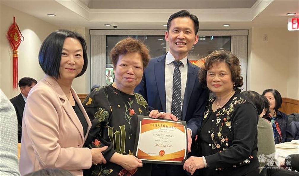 廖朝宏並頒發社區服務獎予會員關美玲,表揚她長期參與波士頓華埠治安巡邏隊,維護地方安全。