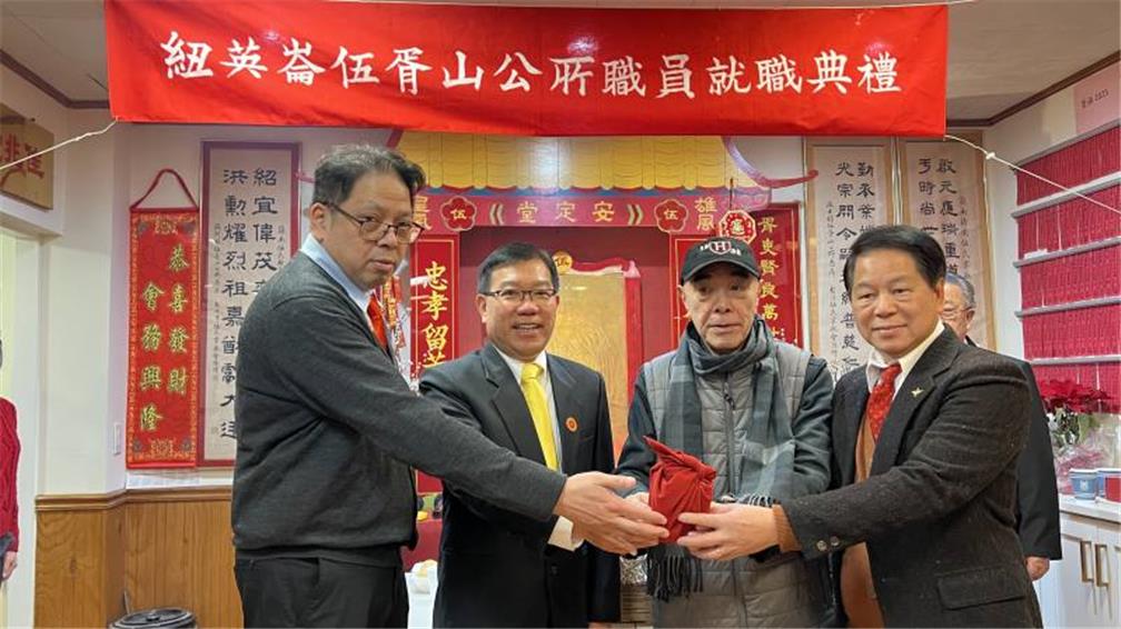 波士頓伍胥山公所1月11日在波士頓華埠泰勒街會址,舉行新舊職員交接典禮。伍振中、伍偉業在麻州參眾議員Nick Collins、黃子安,以及波士頓辦事處,文教中心派員出席的見證下連任主席。
