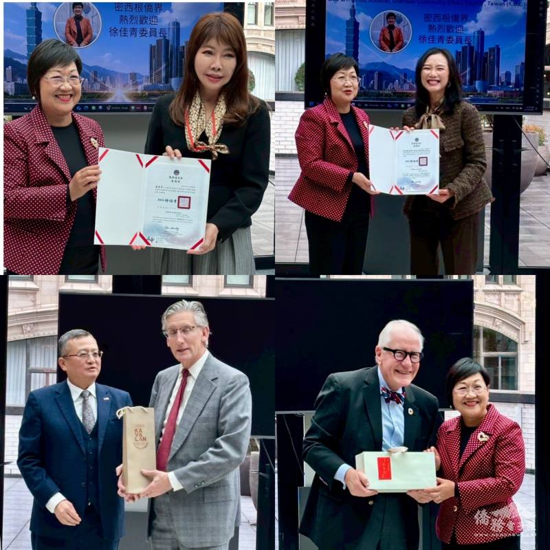 徐佳青頒發僑界舉辦雙十國慶活動感謝狀予僑務委員盧蔓菁(左上)、密西根大專院校聯合校友會會長盧嘉雲_(右上);類延峰致贈密西根領事團主席Nicholas Stasevich(左下)、徐佳青致贈前主席David Roden(右下)紀念品