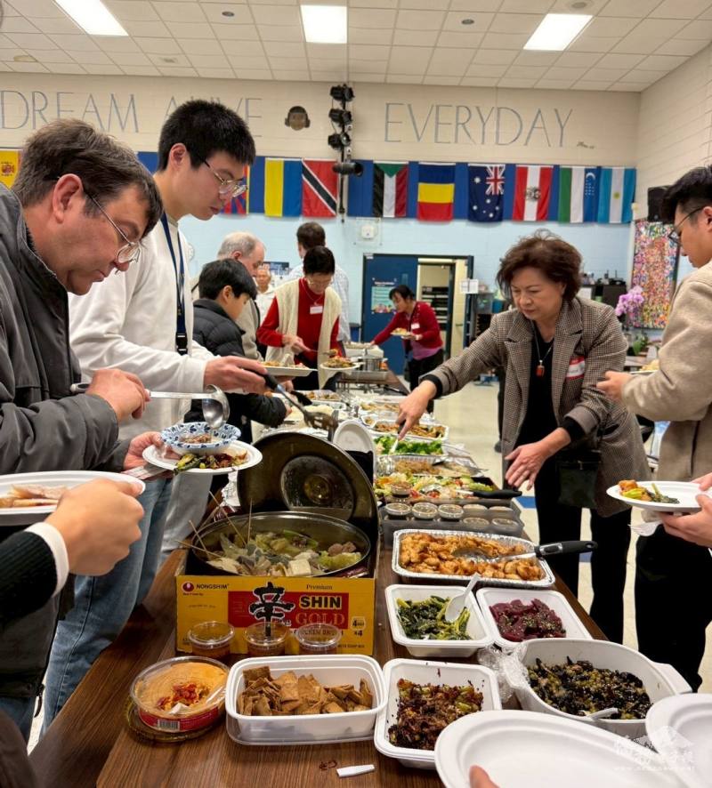 餐會菜色豐富,包括火雞、薑母鴨、火腿、炒米粉、四季豆、辣子雞丁及南瓜派,並有與會者帶來各式配菜與甜點,如壽司、排骨土豆、糯米麻糬、藍莓派、水果及甜湯等。來賓們享受美食與交流,人人心滿意足,期待明年再度相聚。