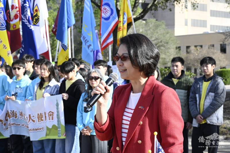 蕭伊芳於致詞中感謝僑胞不畏嚴寒出席升旗典禮,展現對中華民國臺灣的衷心熱愛與支持。她表示,過去一年在友邦與僑界的支持下,克服各項挑戰與困難,使各項工作得以順利推動;展望未來,將持續與理念相近的夥伴攜手合作,強化國防能力與社會韌性,並向全體僑胞祝賀新年快樂、中華民國國運昌隆。