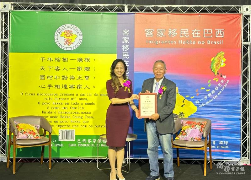 駐聖保羅辦事處處長朱怡靜代表客家委員會贈送感謝狀給鄧幸光老師