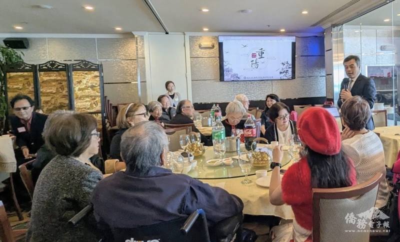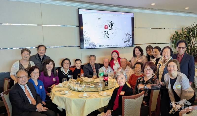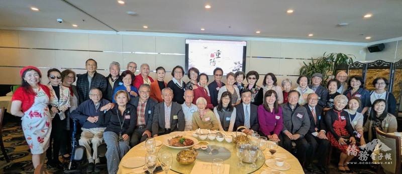 駐舊金山辦事處處長伍志翔中)、金山灣區文教中心主任莊雅淑(中右)出席政大校友會慶重陽邀資深校友共聚