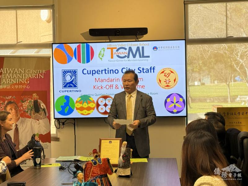 TCML寇惠風校長介紹教學特色,強調全語言技能培養,包括聽、說、讀、寫四大能力學習,亦介紹臺灣多元文化。他分享此次Kitty Moore也是學員之一,期待透過與Cupertino市府合作,將華語教育和臺灣文化推廣到更多社區。