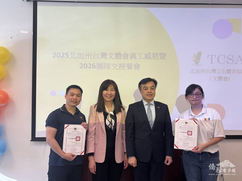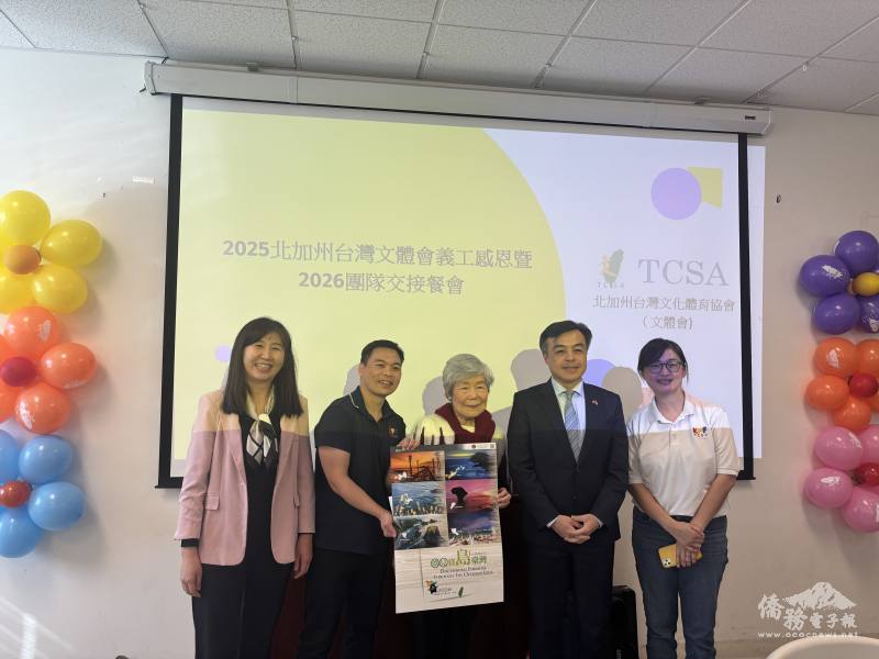 北加州臺灣文化體育協會1月24日於金山灣區文教中心舉辦「2025年義工感恩暨2026年團隊交接典禮」,在駐舊金山辦事處處長伍志翔監交下,卸任會長林宏達交接給新任會長江苑新,金山灣區文教中心主任莊雅淑亦頒發僑委會徐委員長賀狀及感謝狀。
