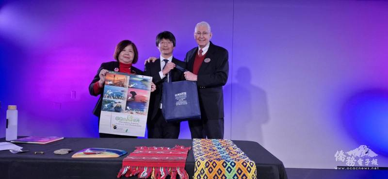 密西根人文協會會長暨大底特律區臺灣商會會長楊逸鴻(左)、芝加哥文教中心主任蔡季穎(中),贈送2026年僑委會「僑見寶島臺灣」月曆以及臺灣文化紀念品給尹因印(右)