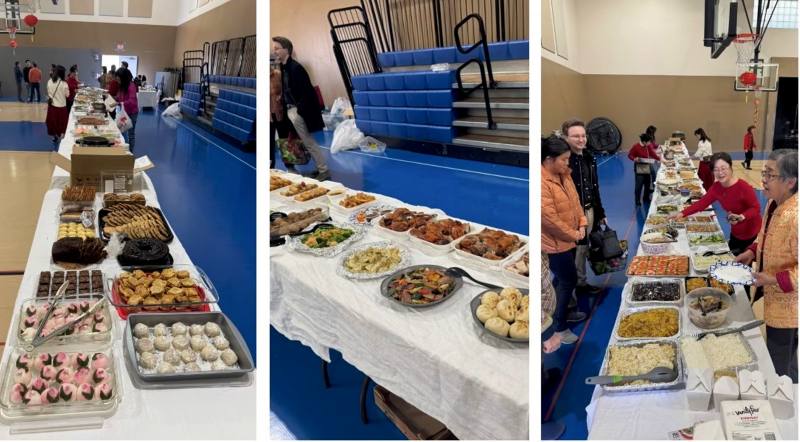聯誼會提供數十道各式外燴年菜、各種甜品與糕點、水果及飲料,讓大家共享農曆大餐