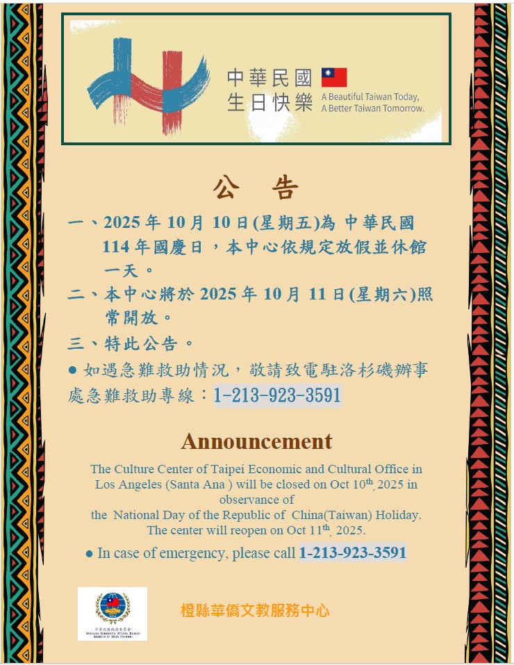 公告:橙僑中心「中華民國國慶日」國定假日休館 / Announcement:About National Day of the Republic of China (Taiwan) Holiday