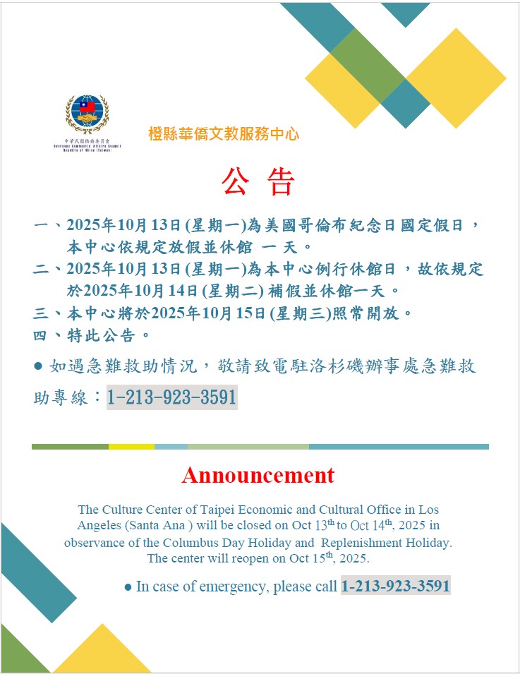 公告:橙僑中心「美國哥倫布紀念日」國定假日休館 / Announcement:About Columbus Day Holiday