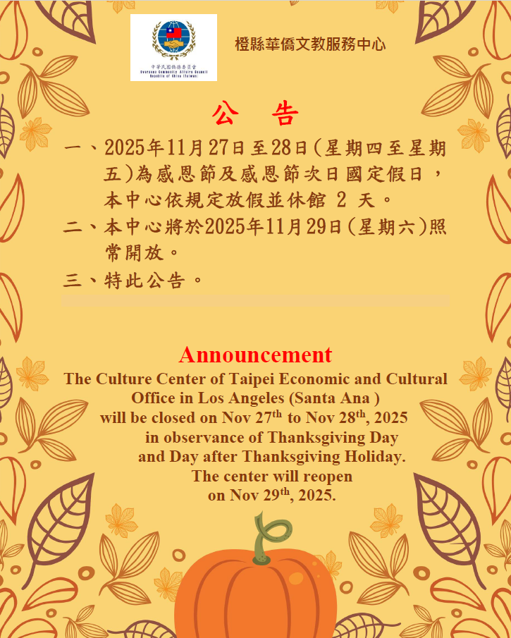公告:橙僑中心感恩節國定假日休館 / Announcement:About Thanksgiving Day and Day after Thanksgiving Holiday
