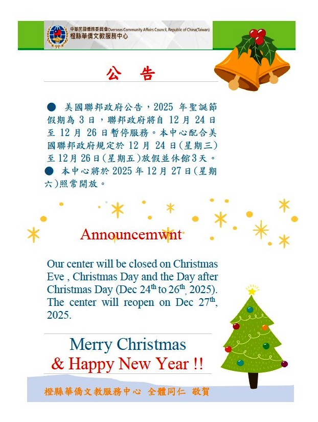 公告:橙僑中心聖誕節國定假日休館 / Announcement:About Christmas Eve, Christmas Day and the Day after Christmas Day Holiday