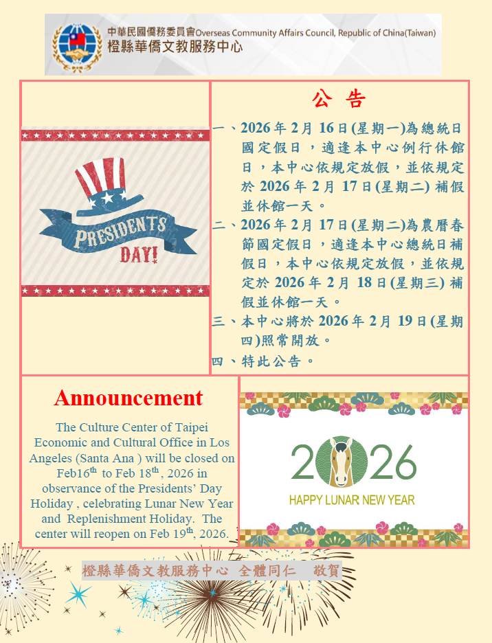 公告:橙僑中心總統日及農曆春節國定假日休館 / Announcement:About Presidents’ Day and Lunar New Year Holiday